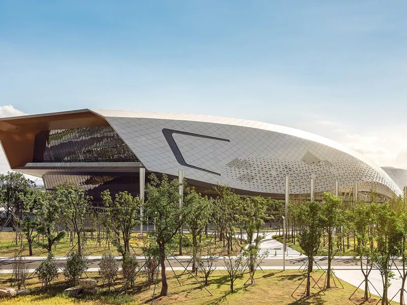 დიდი სიგრძე: ასაწყობი ფოლადის სტრუქტურის სპორტული ცენტრის კომპლექსი აღწევს მრავალფუნქციურ მოქნილ სივრცეებს ​​დიდი მასშტაბის სვეტის გარეშე დიზაინის საშუალებით.